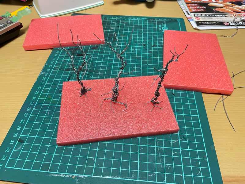 針金ネジネジ捻ってスチレンボードに植え、地面に紙粘土で固定。その後に砂+ボンドを塗る。