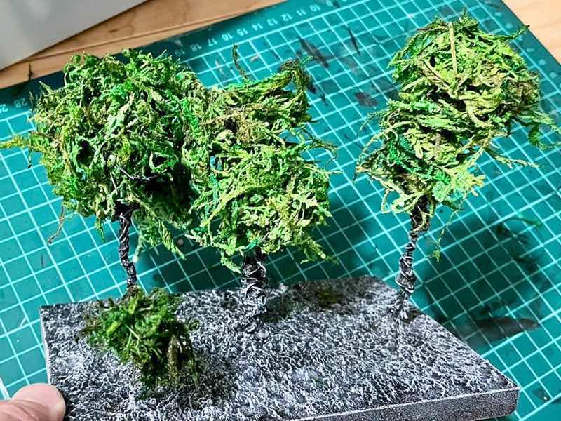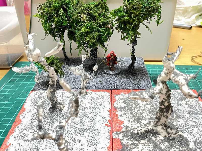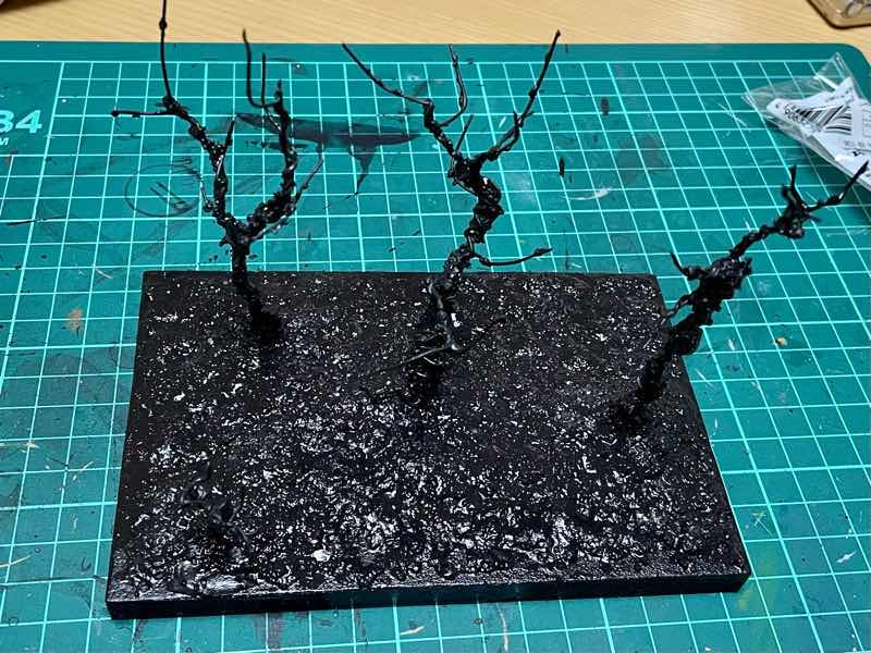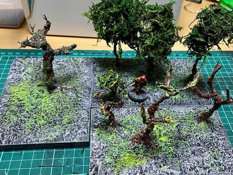 ある程度ペイントして、ミニチュアを置いてみて雰囲気を確認。まだグリーンモスくっつけていないけど、とりあえず問題なさそうなので、コレで量産体制に入ります。